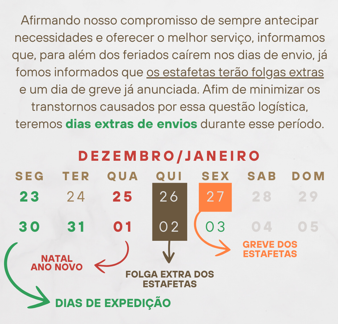 Informamos que, devido a um apagão em Portugal e ao feriado nacional de 01/05/2025 (quinta-feira), os pedidos realizados na terça-feira poderão sofrer atrasos e, eventualmente, não serem entregues ainda esta semana.Estamos empenhados em atender a todos os pedidos o mais rápido possível. Agradecemos pela compreensão.
